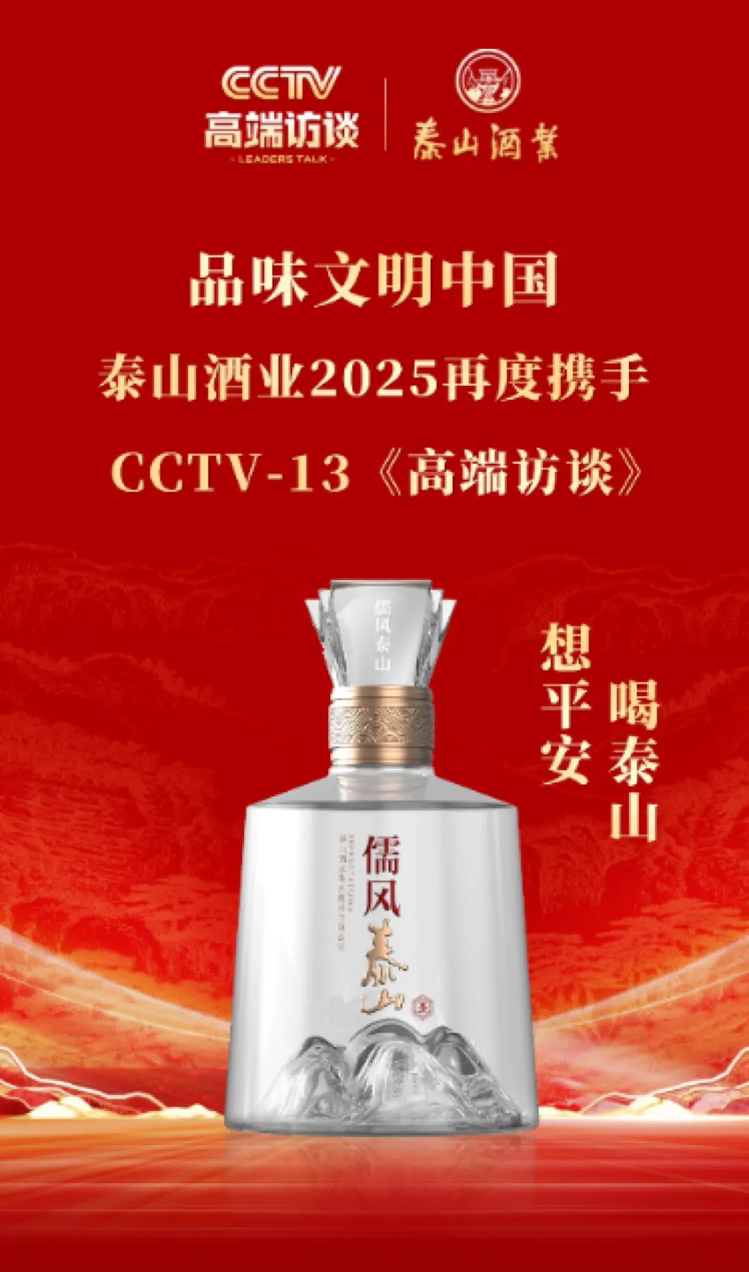 其二,品牌傳播硬支撐。2025年,泰山酒業(yè)以磅礴之勢再度攜手CCTV-13《高端訪談》,其品牌形象與《高端訪談》的高端、權(quán)威、國際化特質(zhì)緊密相連,通過“品味文明中國·儒風(fēng)泰山酒”提示收看《高端訪談》的特殊形式,再次為泰山酒業(yè)的品牌高端化、國際化進(jìn)程注入強勁動力,這不僅是泰山酒業(yè)與央視合作的深化與拓展,更標(biāo)志著泰山酒業(yè)在高端品牌建設(shè)上的戰(zhàn)略飛躍,展現(xiàn)出其對高端市場的敏銳洞察與堅定決心。