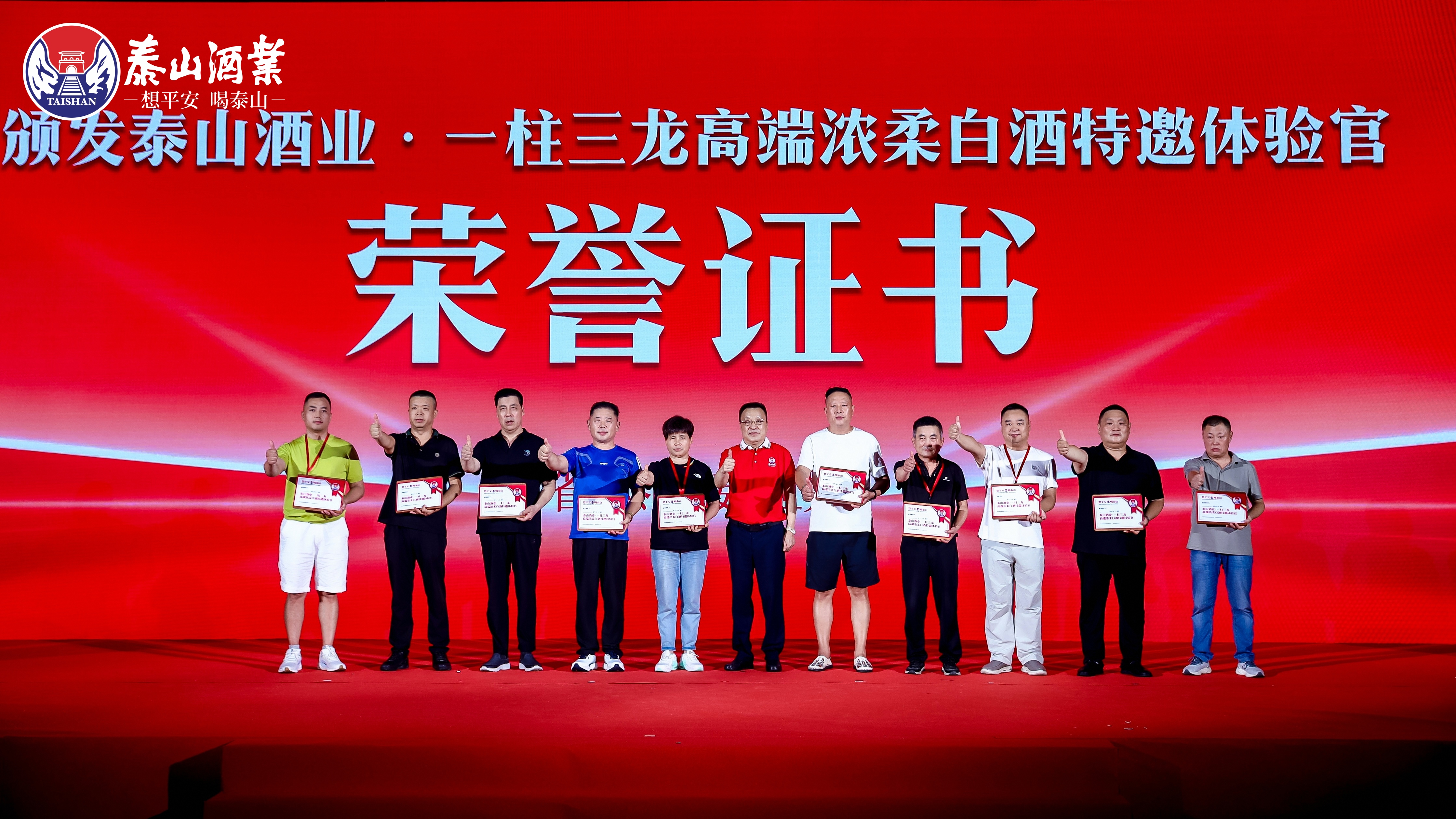 泰酒平安舞翩躚而起,平安符傳遞真摯祝福,讓賓客盡享情誼之暖。泰山酒業(yè)集團(tuán)副總經(jīng)理吳修剛以行云流水般的“五步品鑒法”傾情演繹,引領(lǐng)眾人細(xì)品泰酒“高而不烈,低而不寡,香味諧調(diào),醇厚豐滿,綿柔舒適”的濃柔風(fēng)骨,并特邀十位嘉賓深度品鑒,授予泰山酒業(yè)“一柱三龍高端濃柔特邀體驗官”證書。特邀品鑒官紛紛表示:“真香、真柔、真順滑、不刺喉”。在品鑒宴的高潮時刻便是全體祈福儀式,將平安意境演繹得淋漓盡致,平安吉祥氛圍感染每位來賓。